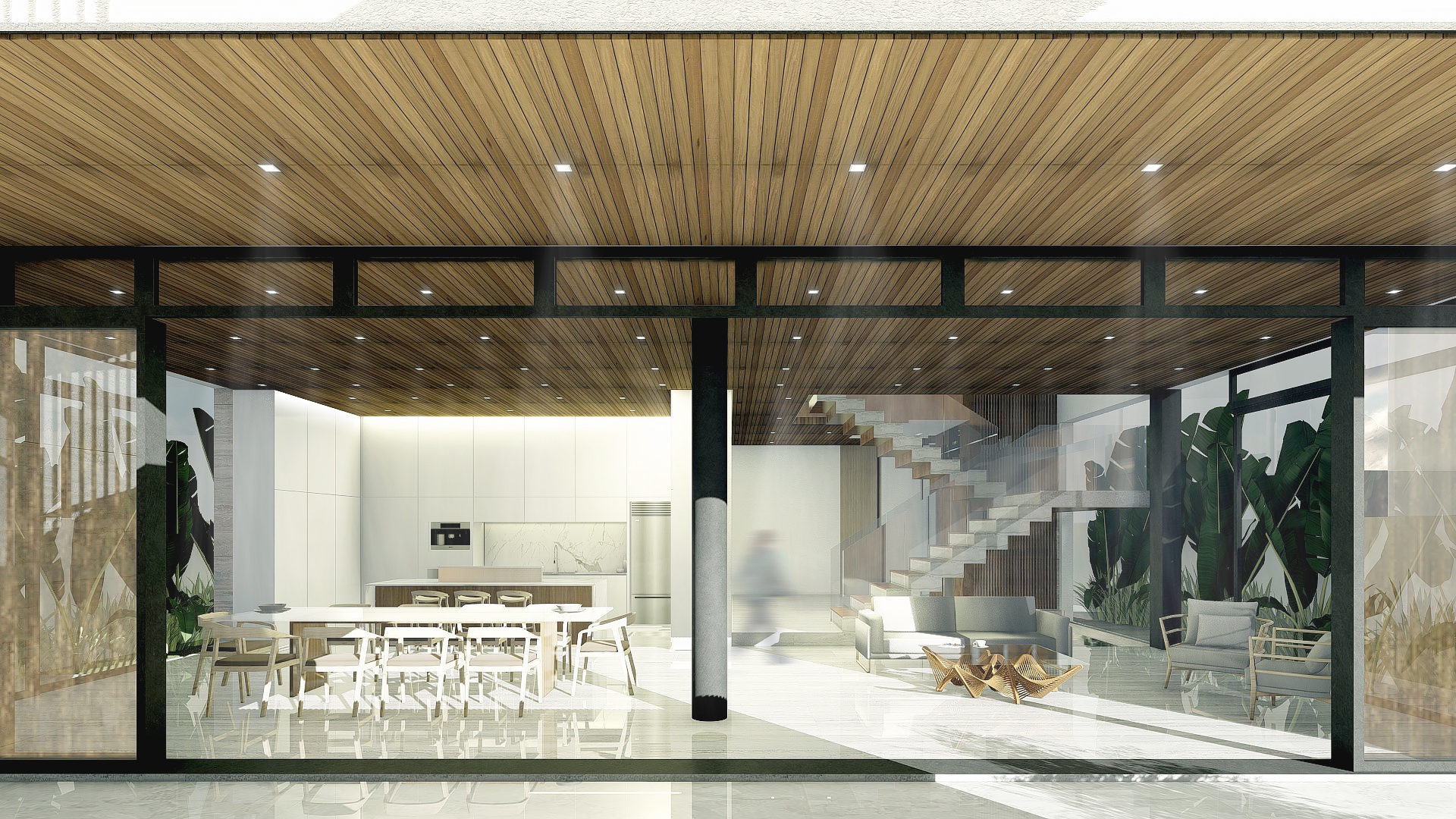 The central Pool acts as the main anchor of the house, wherein the interlocking volumes revolve from. The pool also provides the ventilation shaft that cools the whole residence – acting as an outdoor atrium that encompasses the height of the volumes. Major areas such as the Living and Dining areas, Master Bedroom, Family Area, and Gym all look out into this water feature. Instead of the house being oriented outside, the spaces are looking within, enjoying the interior environments.