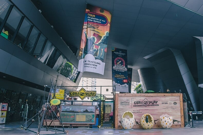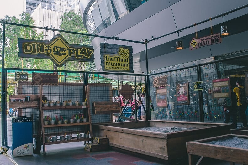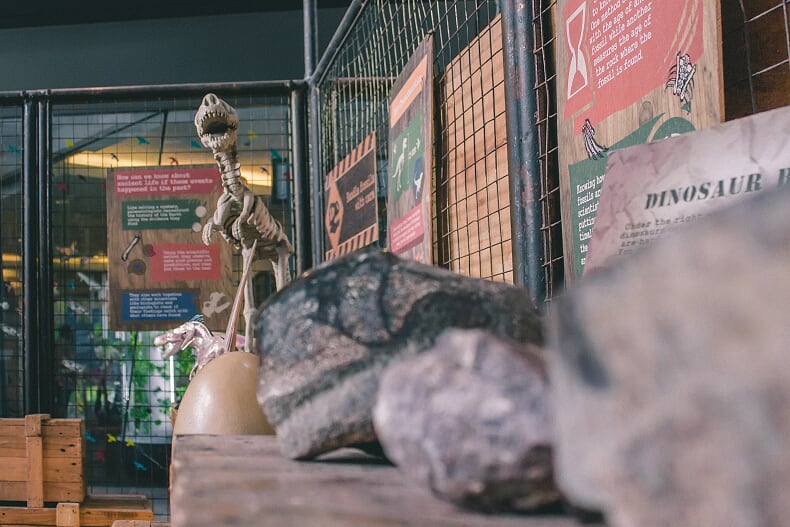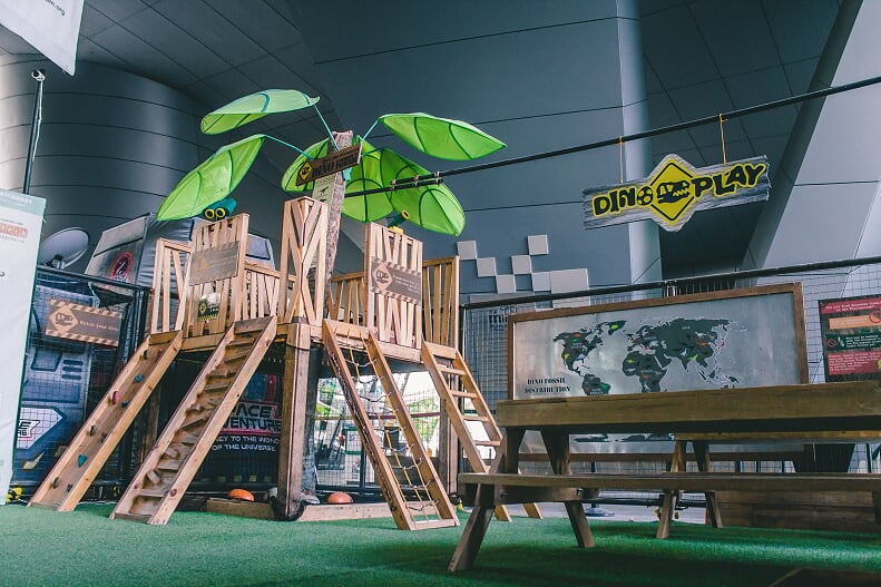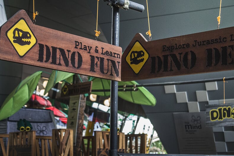 In the Dino Fun area, children can participate in various activities that exercises their learnings from the exhibits. At its center, the Dino Lookout Tower looms over the nest, giving guests a bird’s eye view of the displays below. To get to the top, one can climb the rope ladder or rock-climbing walls that flank the sides of the tower.