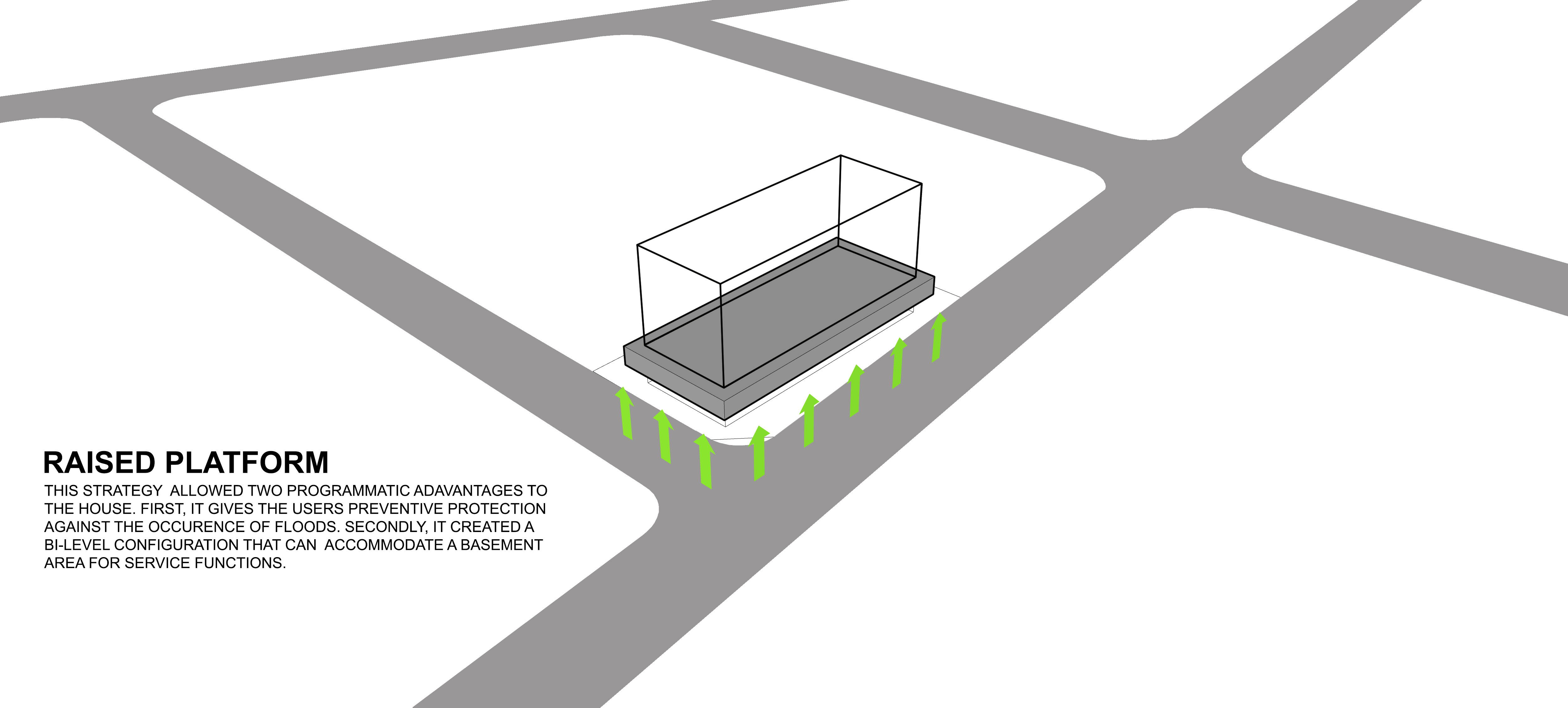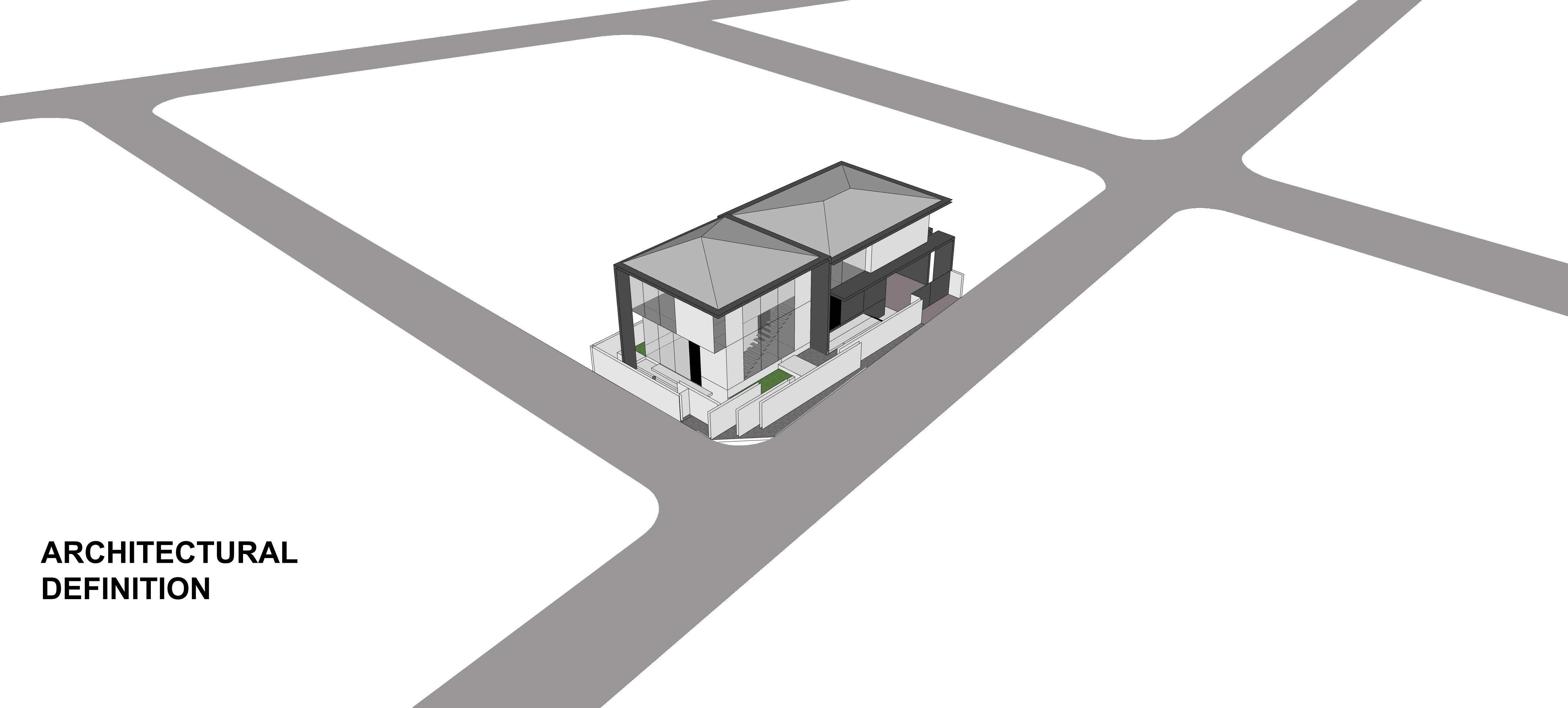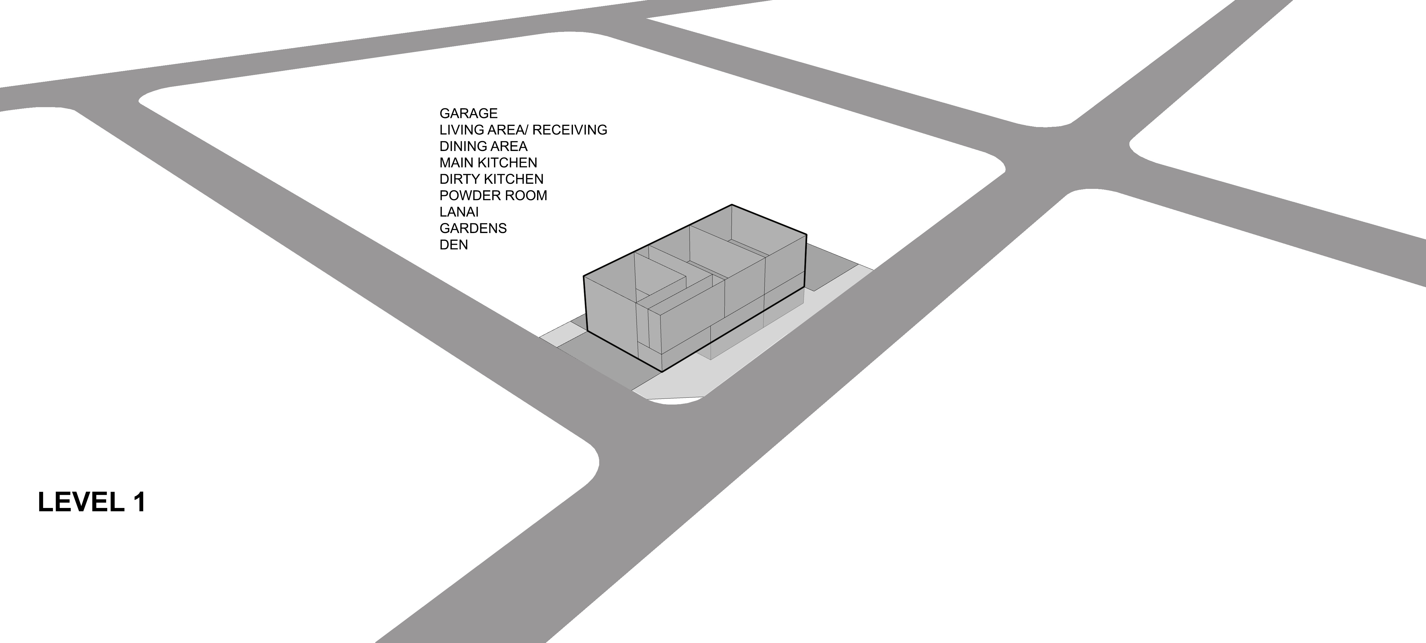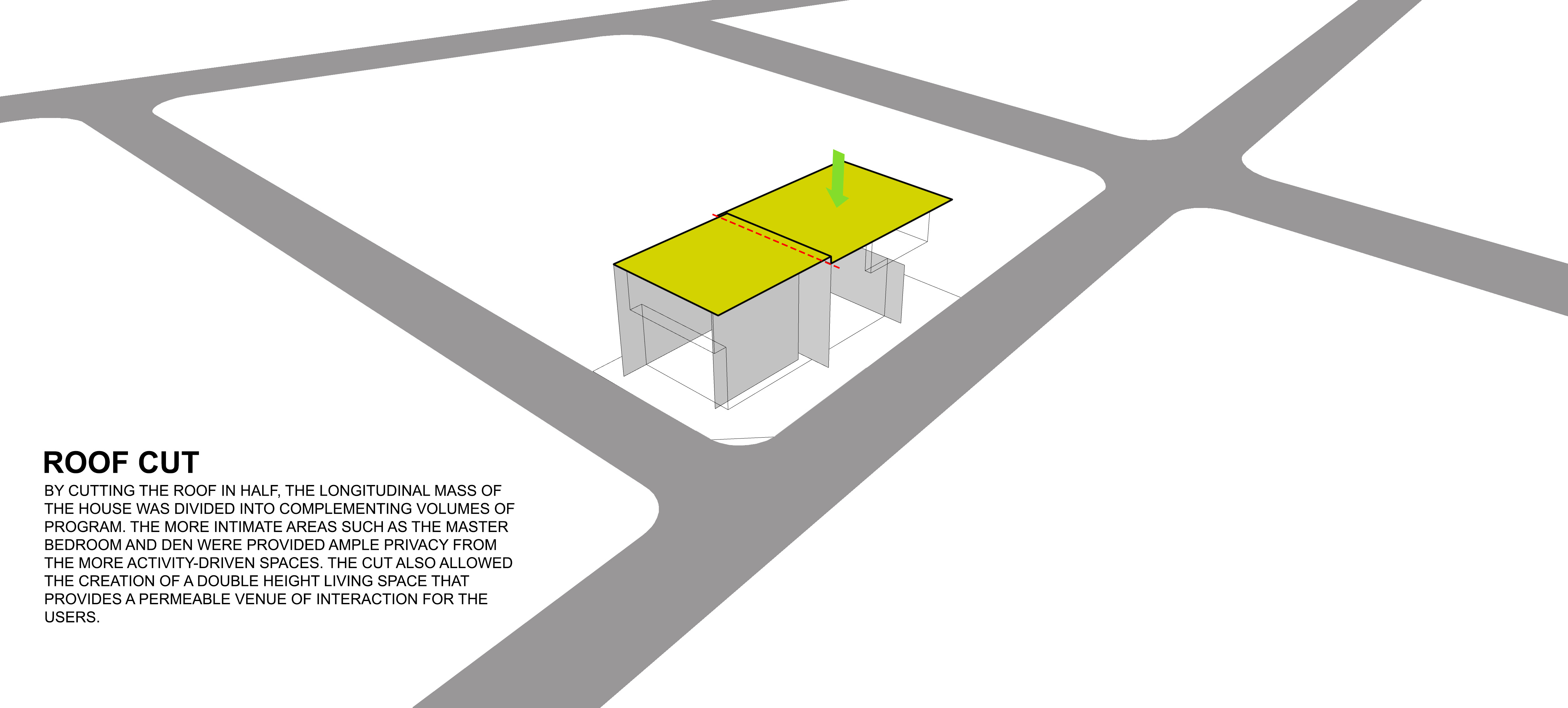 By cutting the roof in half, the longitudinal mass of the house was divided into complementing volumes of program. The more intimate areas such as the Master Bedroom and Den were provided ample privacy from activity-driven spaces. The cut also allowed the creation of a double height living space that provides a permeable venue of interaction.