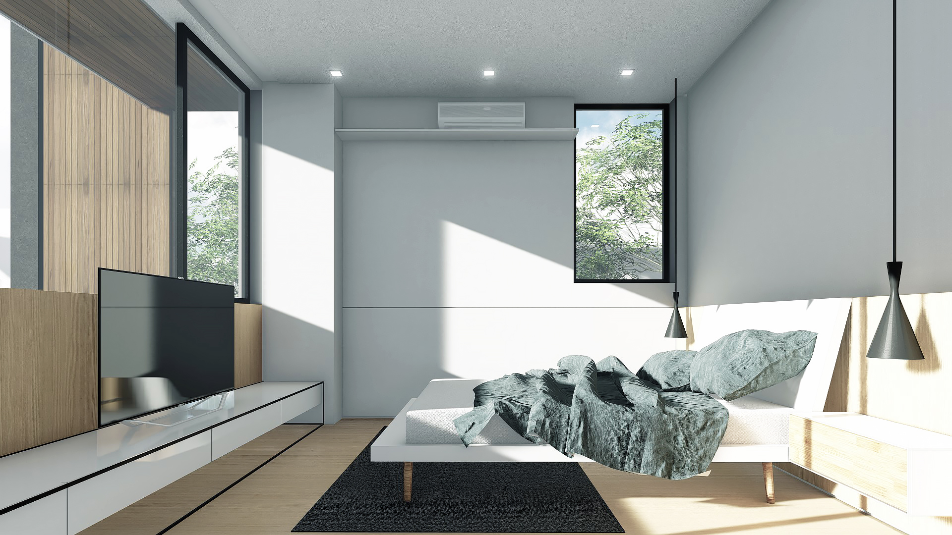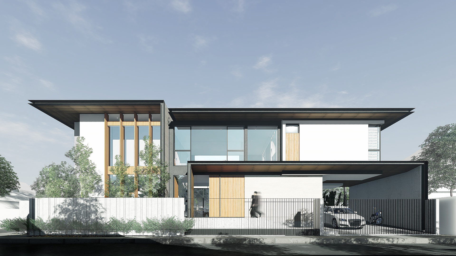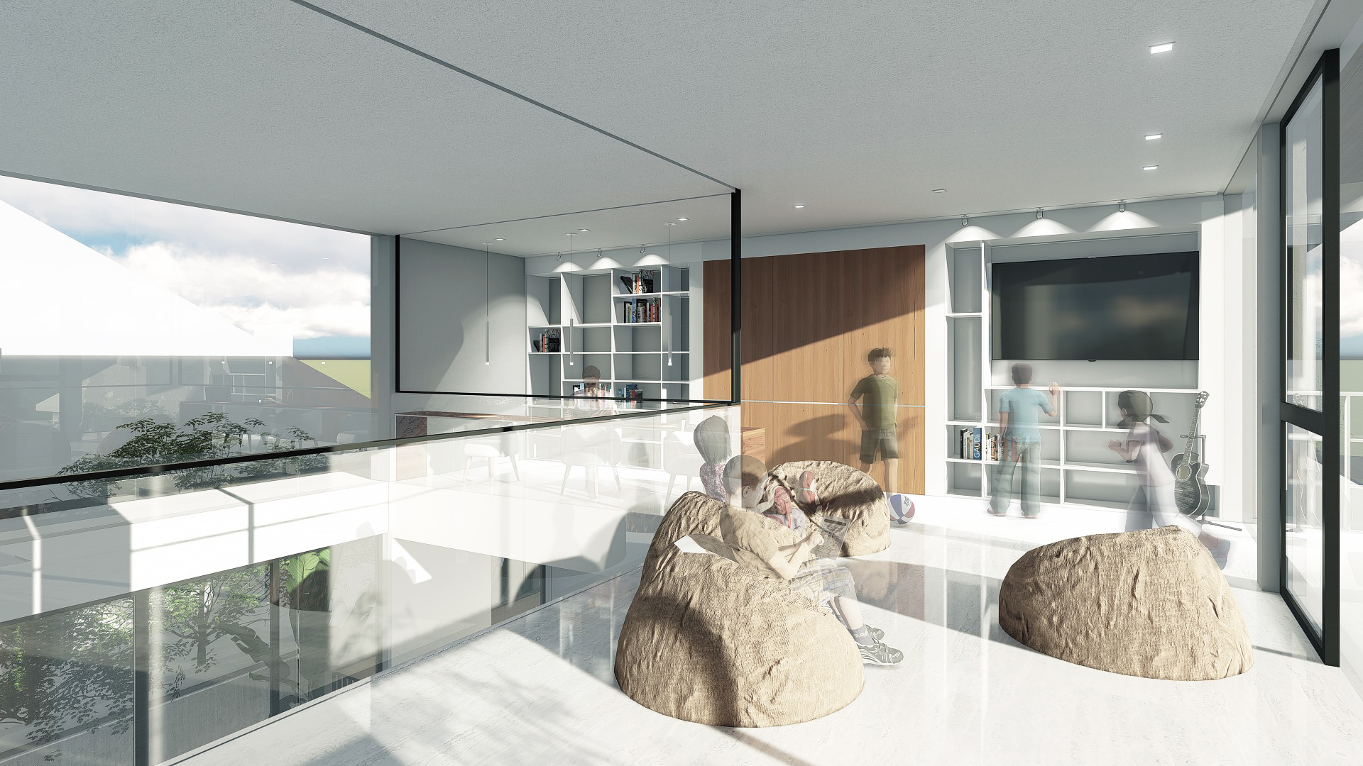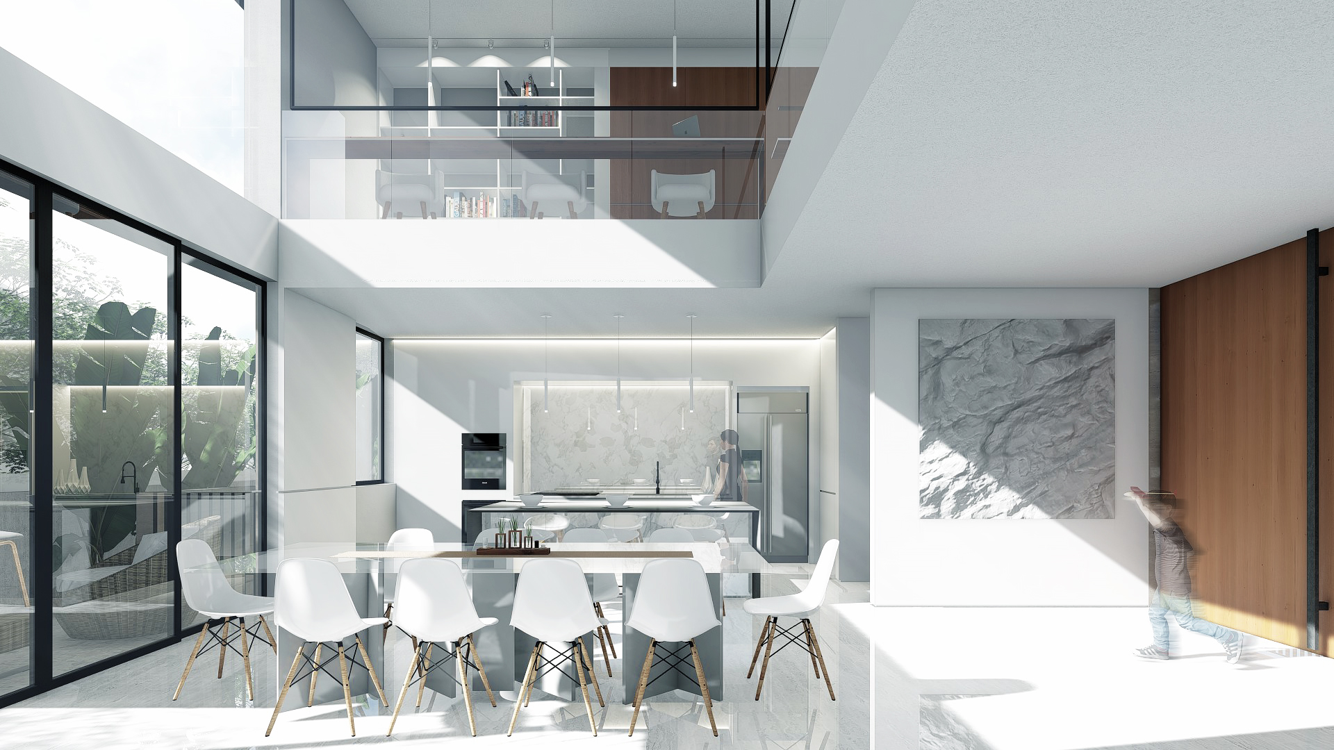 By cutting the roof in half, the longitudinal mass of the house was divided into complementing volumes of program. The more intimate areas such as the Master Bedroom and Den were provided ample privacy from activity-driven spaces. The cut also allowed the creation of a double height living space that provides a permeable venue of interaction.